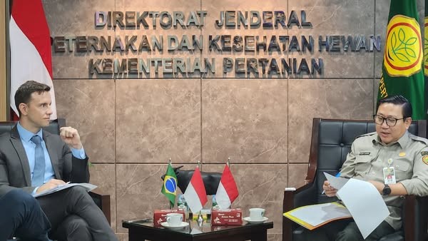 Jakarta - Sebagai bagian dari upaya memperkuat ketahanan pangan nasional dan mendukung pelaksanaan program Makan Bergizi Gratis (MBG), Direktur Jenderal Peternakan dan Kesehatan Hewan (Dirjen PKH) Kementerian Pertanian, Agung Suganda, menerima kunjungan Deputy Secretary for International Affairs and Trade of the Ministry of Agriculture and Livestock (MAPA) Brasil, Marcel Moreira, di Kantor Pusat Kementan, Jakarta. Pertemuan ini menjadi langkah nyata dalam mempererat kerja sama strategis antara Indonesia dan Brasil di sektor peternakan (20/10).