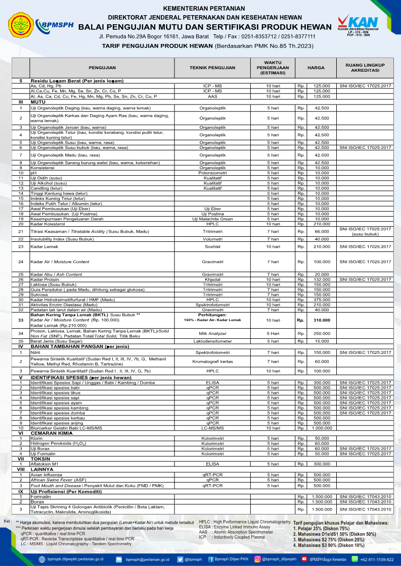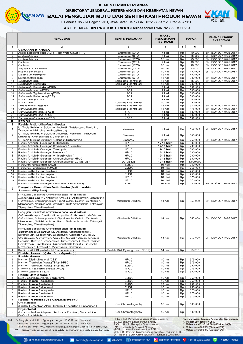 Tarif UjiPengujian Keamanan dan Mutu Produk Hewan17/03/2025 14:23:27 -